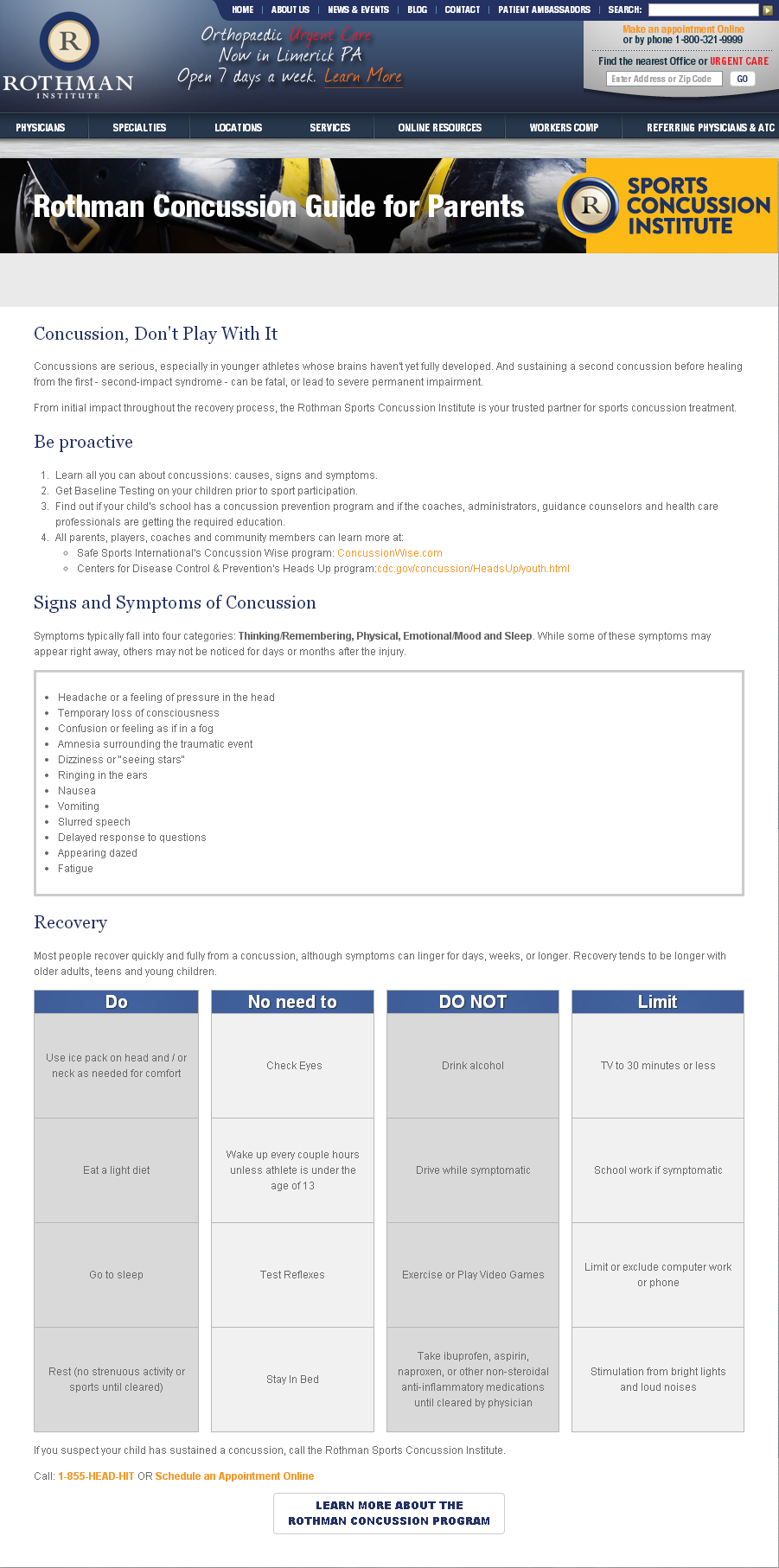 Rothman Institute is a leading provider of orthopedic care, renowned for its expertise in sports medicine, among other specialties. I worked on a campaign promoting their Sports Concussion Institute, which required me to develop a deep understanding of concussions, their impact on athletes, and the latest treatment approaches. This knowledge was then translated into clear, engaging messaging for Rothman's website and digital ads. The goal was to communicate the institute's specialized expertise in concussion management, ensuring that both athletes and their families could easily access important information and feel confident in Rothman’s ability to provide expert care. Through this work, we positioned the institute as a trusted leader in sports concussion treatment.